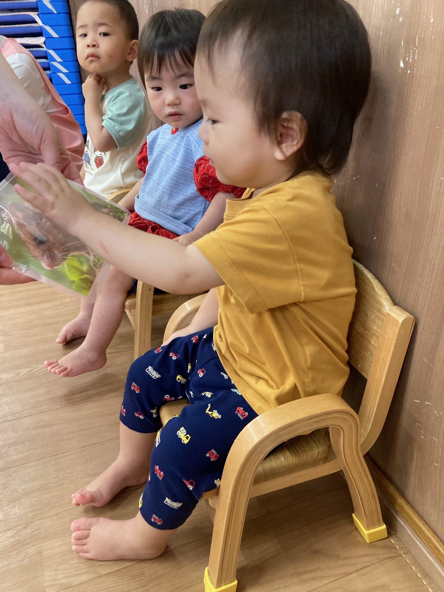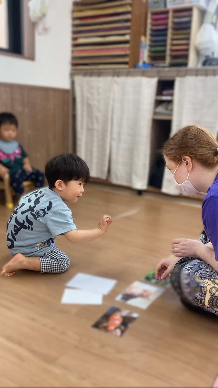 リナ先生から英語の単語を教えてもらい、一人ずつ写真にタッチしていきます✋✨