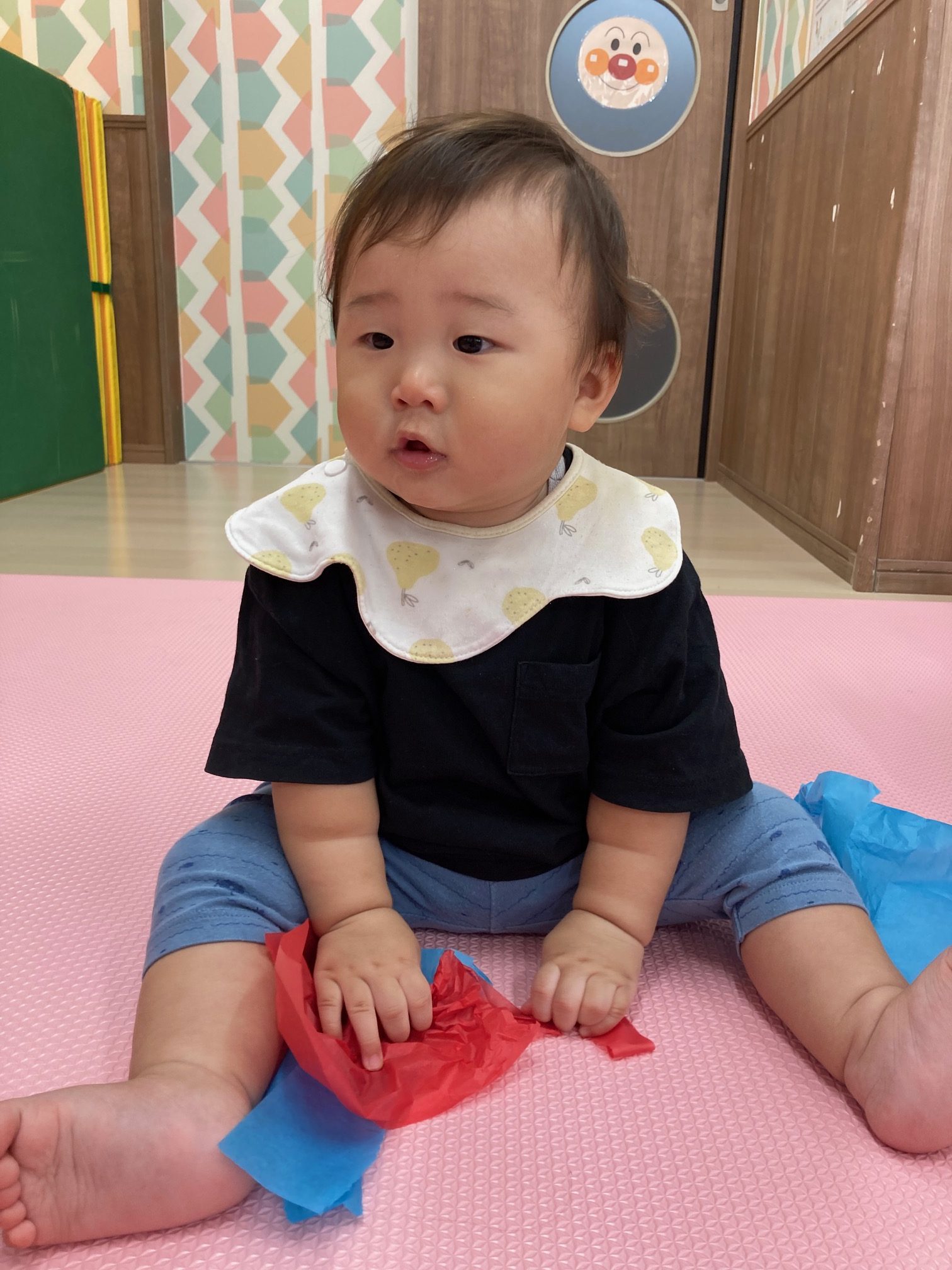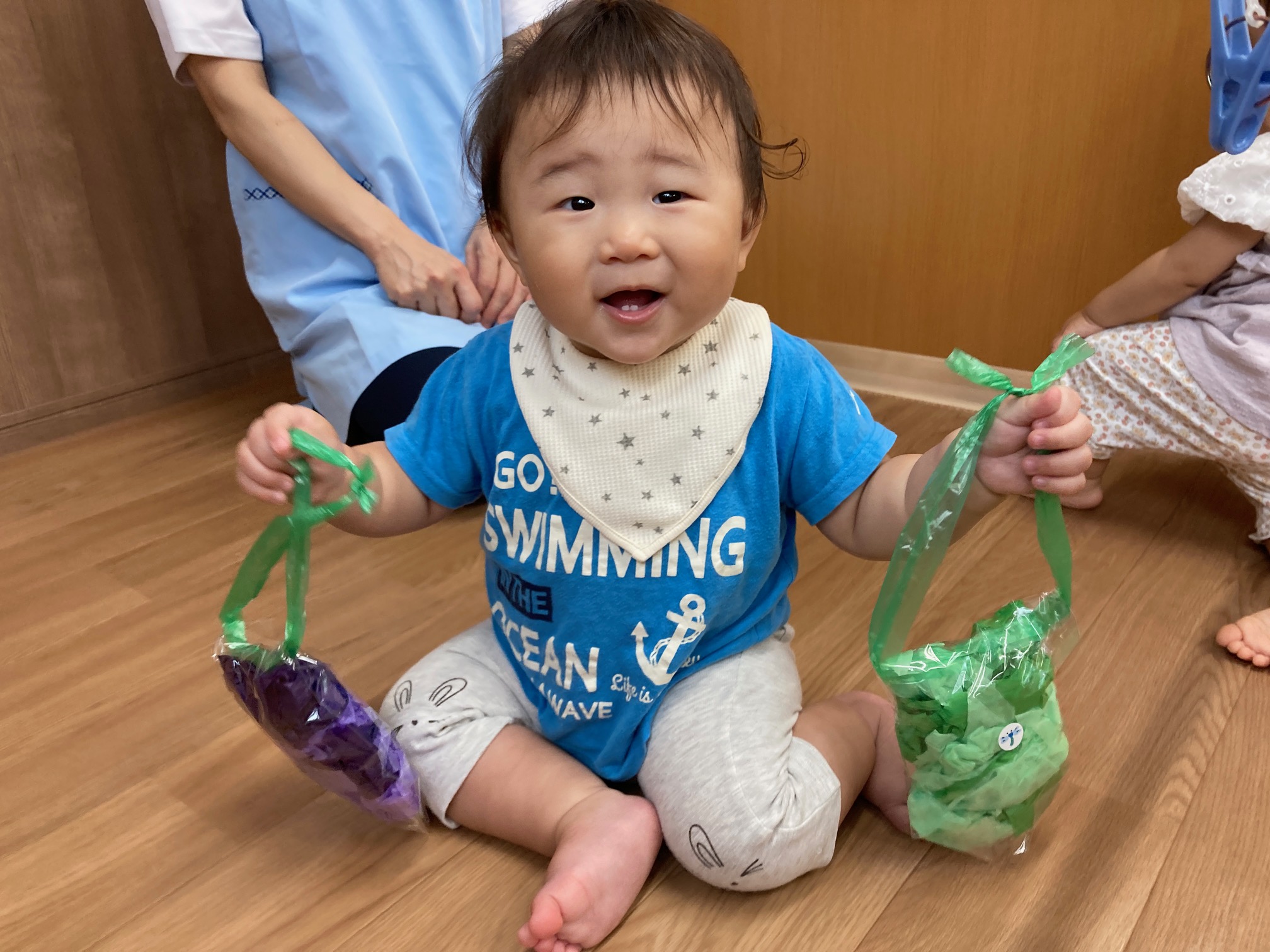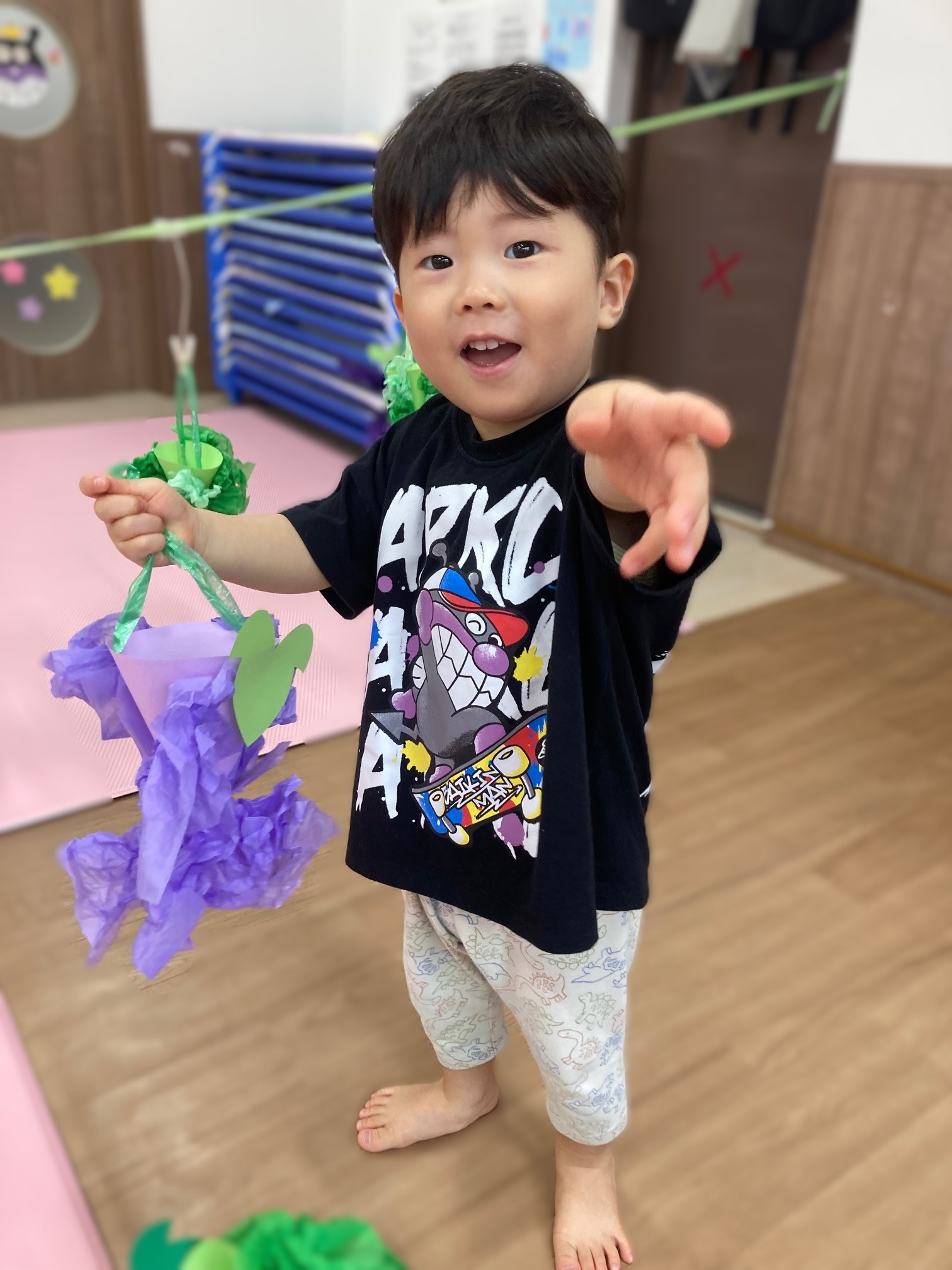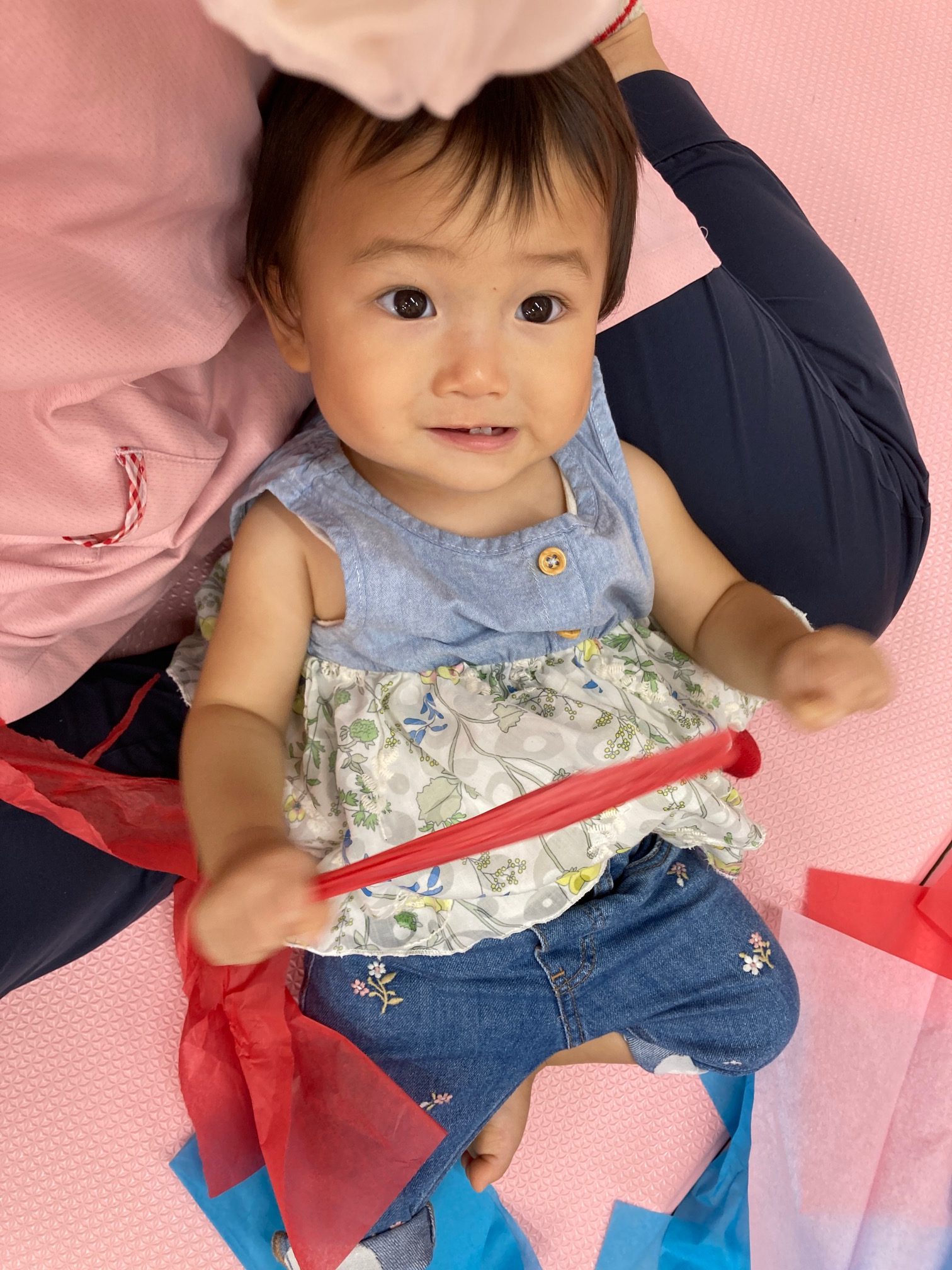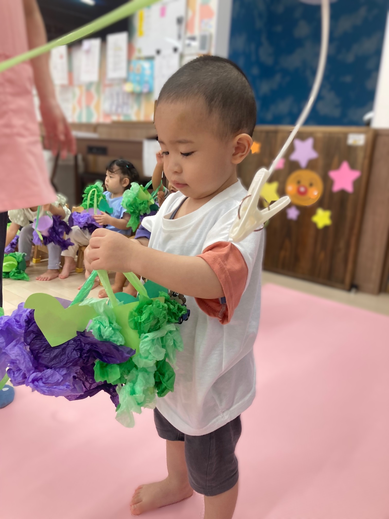 スズランテープに触れて感触を楽しんだり、割いて細くしたり、引っ張ったり、ヒラヒラ降らしたりと思い思いに遊びました🎶